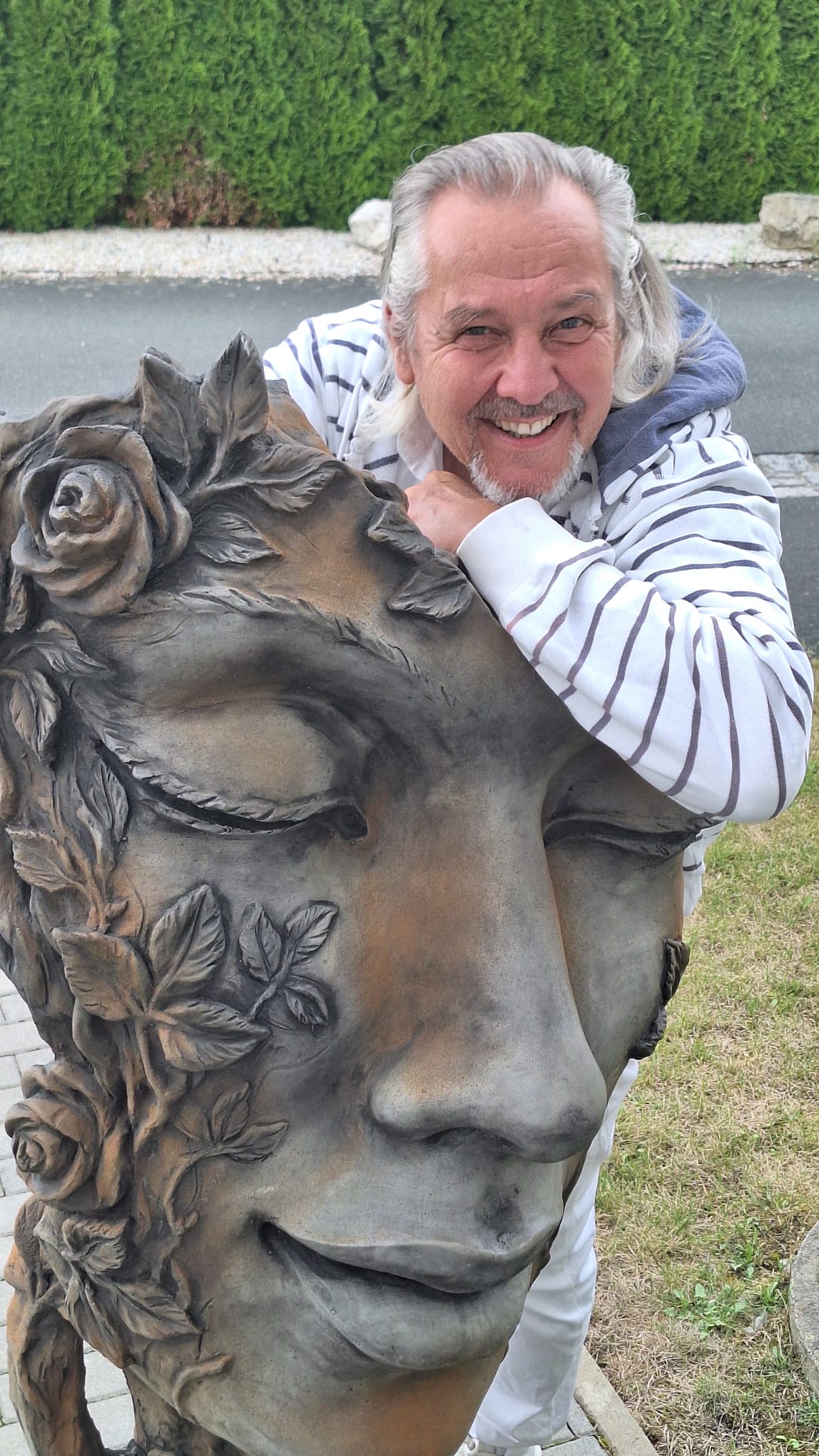 Einige Monate später machte ich mich auf in ihren Ort. Und tatsächlich: Ihr Haus war umgeben von einem Rosengarten, der selbst wie ein kleines Paradies wirkte. Zwischen den Rosen standen unzählige Figuren aus Steinguss, jede von ihnen voller Seele, jede ein Ausdruck von Schönheit, Beständigkeit und Tiefe.